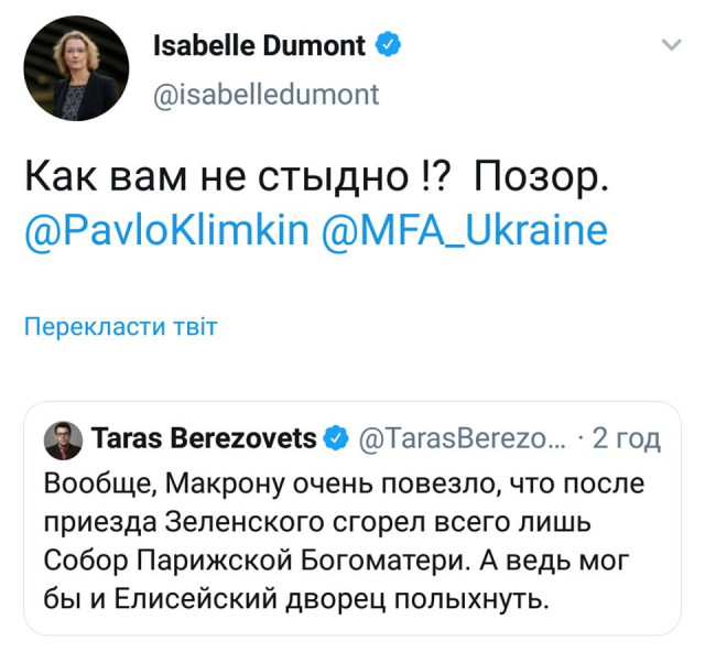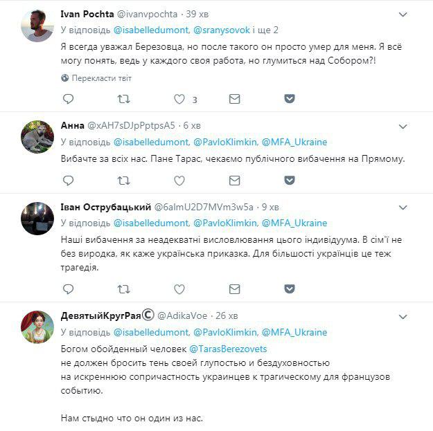 У відповідях до твіту Ізабель Дюмон українці масово засуджують слова Березовця та зазначають, що співчувають втраті французького народу.Як повідомлялося, близько 19 години 15 квітня загорівся Собор Паризької Богоматері у Франції. Внаслідок пожежі впав шпиль історичної будівлі, також вогонь знищив дах. Загоряння намагаються ліквідувати близько 400 пожежників. На площі перед собором зібралося кілька тисяч осіб, люди плачуть, хтось знімає, хтось прийшов з національними прапорами. Французькі пожежники не впевнені, що зможуть зупинити поширення вогню, що охопив Собор Паризької Богоматері. У пожежній службі пояснили, що не виключають, що в Соборі в результаті згорять всі дерев'яні конструкції.