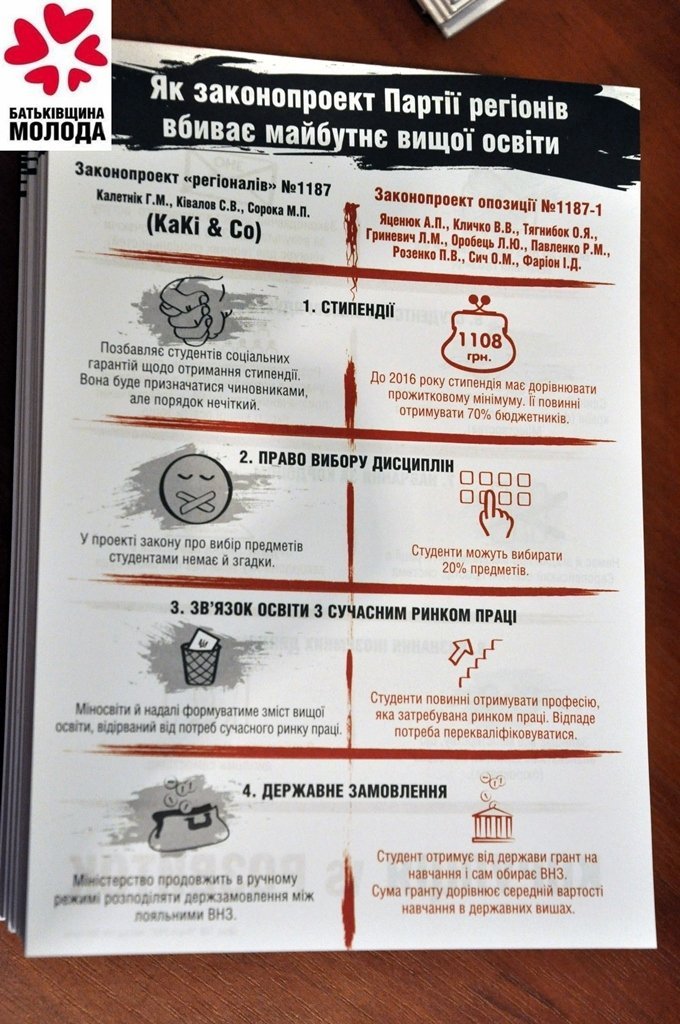 Організатори «круглого столу» ВО «Батьківщина молода», «Фронт змін» молодіжне крило та «Молодий Народний Рух» переконані, що законопроект «Про вищу освіту» Ківалова-Калетніка повертає країну назад на 5 років. Закон «регіоналів» зменшує значимість зовнішнього незалежного оцінювання, натомість повертає до часів, коли відігравали суттєву роль іспити та бал шкільного атестату. Окрім цього, студенти фактично позбавлені впливати на ті процеси, які відбуваються у вищій школі. Опозиціонери ж пропонують законопроект, де студентство матиме можливість бути безпосереднім учасником усіх процесів, які стосуються вишів. Є питання до державного замовлення та визнання дипломів іноземних вишів.