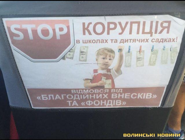 На цю думку наштовхує місцева «антикорупційна» реклама, яка закликає: «Stop. Корупція в школах та дитячих садках! Відмовся від «благодійних внесків» та «фондів».Світлину, зроблену під час проїзду в луцькій маршрутці № 11, Інформаційному агентству Волинські Новини надав один із постійних читачів.
