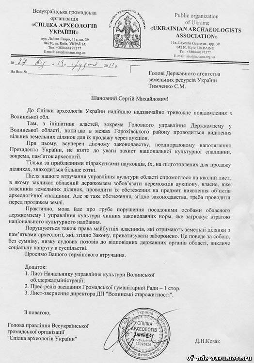 Голова Спілки археологів України Денис Козак попросив втрутитися до ситуації, яка склалася в Горохівському районі Волині, голову Держкомітету земельних ресурсів Сергія Тимченка. Із цього приводу навіть листа написав. У документі йдеться про те, що «з ініціативи влади, зокрема Головного управління Держкомзему у Волинській області, поки що в межах Горохівського району проводиться виділення вільних земельних ділянок для продажу через аукціон».