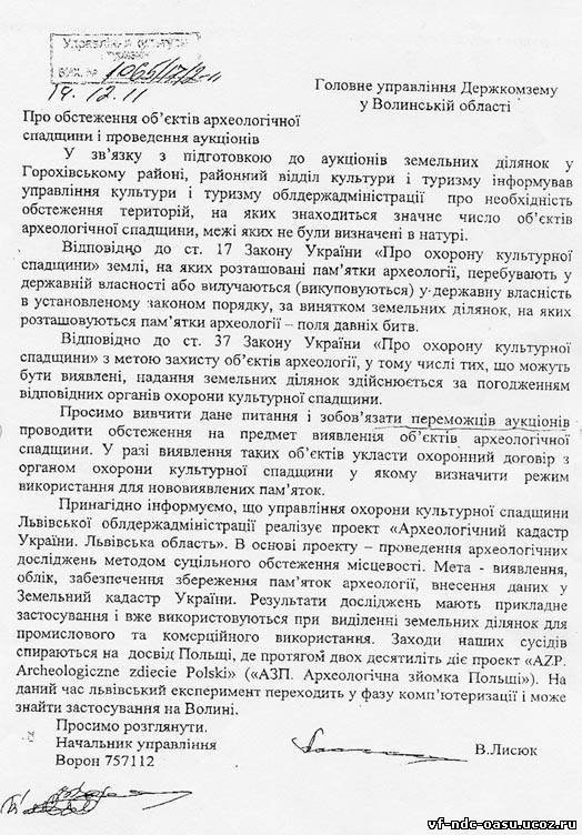 «У зв’язку з підготовкою до аукціонів земельних ділянок у Горохівському районі, районний відділ культури і туризму інформував управління культури і туризму облдержадміністрації про необхідність обстеження територій, на яких знаходиться значне число об’єктів археологічної спадщини, межі яких не визначені в натурі», - йдеться у цьому листі за підписом начальника управління Володимира Лисюка.