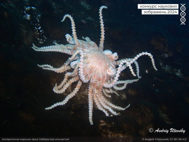 Інша світлина Олександра отримала п'яте місце в категорії «Живі організми». На цьому фото вчений зафіксував момент дефекації субантарктичного пінгвіна (дженту). Гуано цих пінгвінів має суттєвий вплив на наземні екосистеми Антарктики: воно може і сприяти зростанню місцевої флори, і пригнічувати його.У цій же категорії четверта сходинка дісталася роботі полярного біолога Андрія Утєвського. На ній зображена антарктична морська зірка Лабідіастер кільчастий – активний хижак, що полює на всіх доступних бентосних безхребетних і навіть на своїх родичів. Знімок зроблено в акваторії станції «Академік Вернадський» на глибині близько 40 метрів.Читати ще: Біла веселка, міражі, перламутрові хмари: українські полярники показали незвичайні природні явища біля «Вернадського»