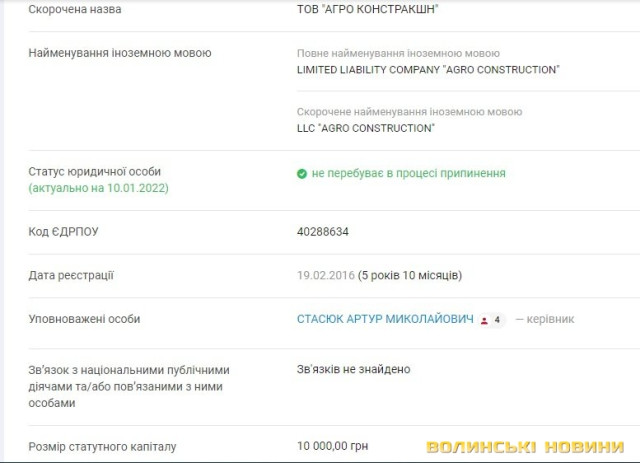 ТзОВ «Агро Констракшн» зареєстроване у Києві. Фірма належить директору Артуру Стасюку і Денису Погребняку з Харкова. Статутний капітал підприємства, створеного у 2016 році, всього лиш 10 тисяч гривень.Але незважаючи на це підприємство за час діяльності виграло тендерів на суму понад 400 мільйонів гривень, з них на 358,6 мільйона гривень – у 2021 році на торгах, організованих Держмитслужбою.Найбільший тендер – «Реконструкція існуючих та будівництво нових об’єктів інфраструктури пункту пропуску «Ужгород» ІІ черга (пасажирський напрямок) та влаштування стику доріг (ув’язка) пункту пропуску «Ужгород» зі словацькою стороною (коригування)» за 155,7 мільйона гривень.