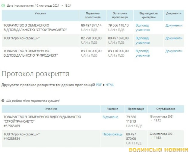 Очікувана вартість робіт, заявлена Держмитслужбою, 83,175 мільйона гривень. Переможцем була визнана фірма «Агро Констракшн», яка запропонувала 80,5 мільйона гривень. До слова, це була не найнижча цінова пропозиція. Менше – 79,7 мільйона гривень пропонувало ТОВ «СТРОЙТРАНСАВТО», проте його пропозицію відхилили.Тендерний комітет мотивував таке рішення тим, що в складі тендерної пропозиції не було низки документів: гарантійних листів, довідок, усього – 12 позицій.