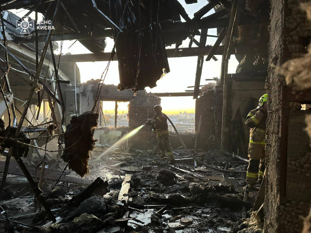 У Печерському районі сталася пожежа ресторану на 33-му поверсі житлового будинку на площі 50 м кв.,частково зруйновано будівельні конструкції 34-го технічного поверху. Пожежу ліквідовано Потерпілих немає.У Солом’янському районі на території підприємства виникла пожежа складської будівлі на площі 600 м. кв. Інформацію про постраждалих уточнюють. За іншою адресою — загоряння автомобіля та одноповерхової допоміжної споруди, пожежу ліквідовано. Уламки впали й на території медичного центру, горів перший поверх триповерхової будівлі, пожежу ліквідовано. Постраждалих немає.Читати ще: Росіяни вдарили по Запоріжжю: шестеро загиблих, дев’ятеро поранених
