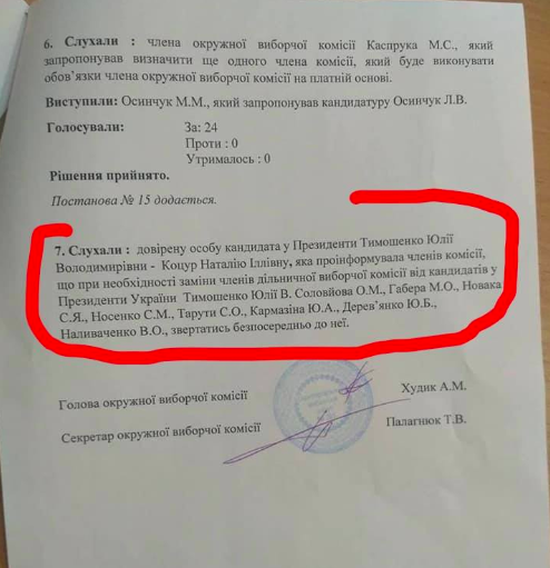 Звинувачень в тому, що технічні кандидати розставляють своїх людей до виборчих комісій, які будуть «кувати перемогу», не вдалося уникнути і Юлії Тимошенко. У ЗМІ з’явився витяг з протоколу одного нічим не примітного виборчкому в Чернівецькій області, з якого випливає, що довірена особа Тимошенко Наталія Коцур поінформувала присутніх, що всі питання, пов’язані із заміною членів дільничної комісії відразу від восьми кандидатів, потрібно вирішувати через неї.З цього документа стало відомо, що довірена особа лідера «Батьківщини» керує членами комісій відразу восьми кандидатів, яких тут же стали називати «технічними» для Тимошенко. Серед всіх фігурантів цього списку тільки один – Сергій Тарута – публічно заявив про підтримку кандидатури Тимошенко. Ще один – екс-глава СБУ Валентин Наливайченко – ще до старту виборчої кампанії заявляв про готовність об’єднувати зусилля з Тимошенко.