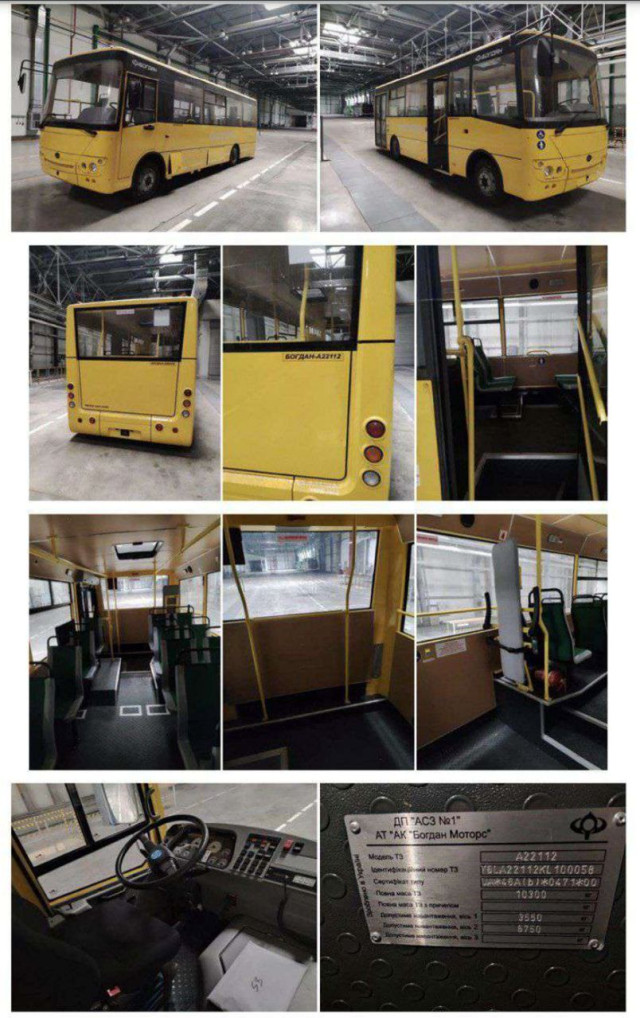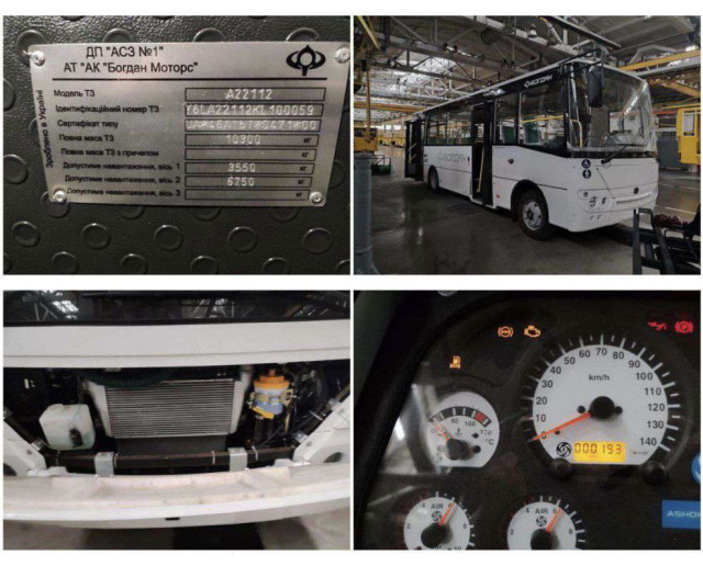 - автобус А22112 марки «Богдан», пробіг – 99 км, 2019 року випуску;- автобус А22112 марки «Богдан», пробіг – 107 км, 2019 року випуску;- автобус А22112 марки «Богдан», пробіг – 193 км, 2019 року випуску;- автобус А22112 марки «Богдан», пробіг – 111 км, 2019 року випуску.Усі автобуси, як вказано в описах, нові. Об’єми двигунів – 5760 см куб. Тип палива – дизель.