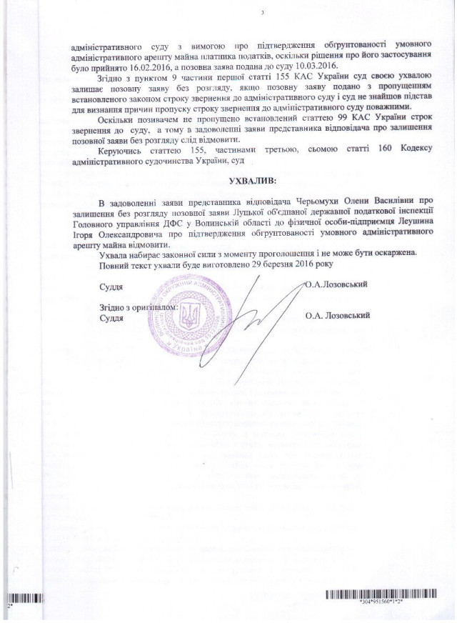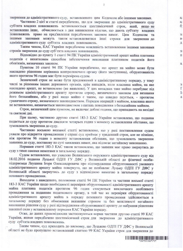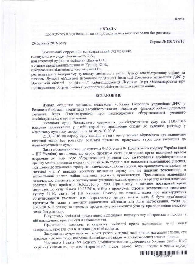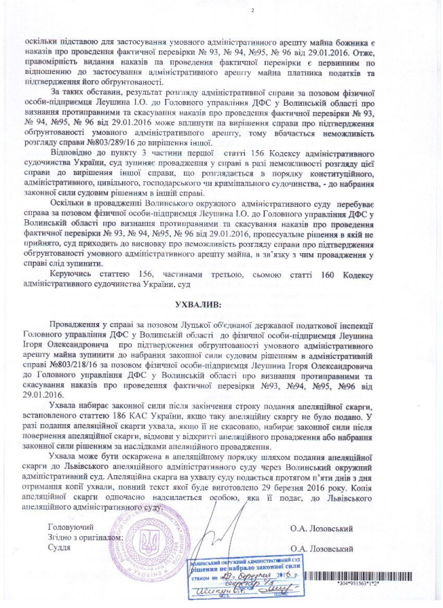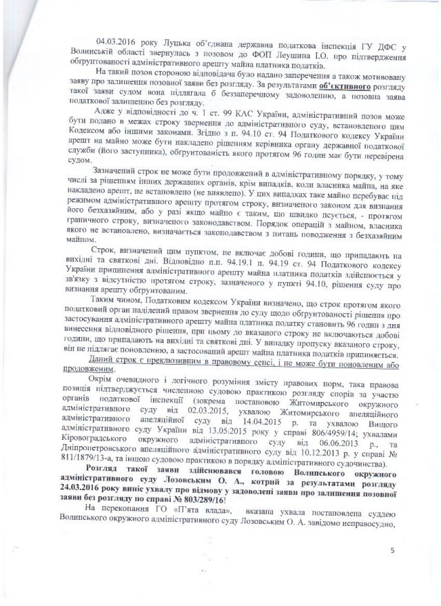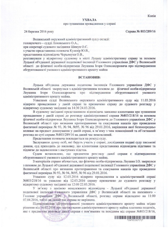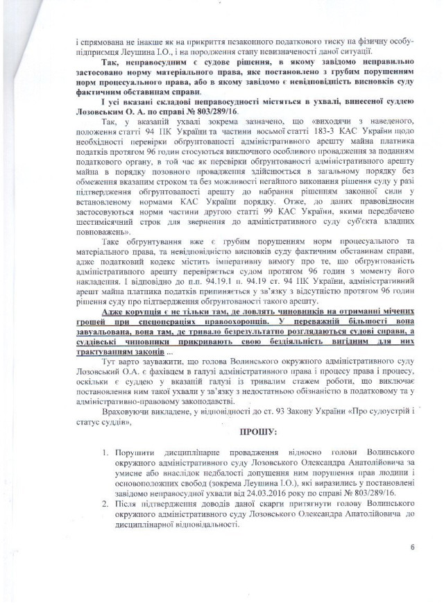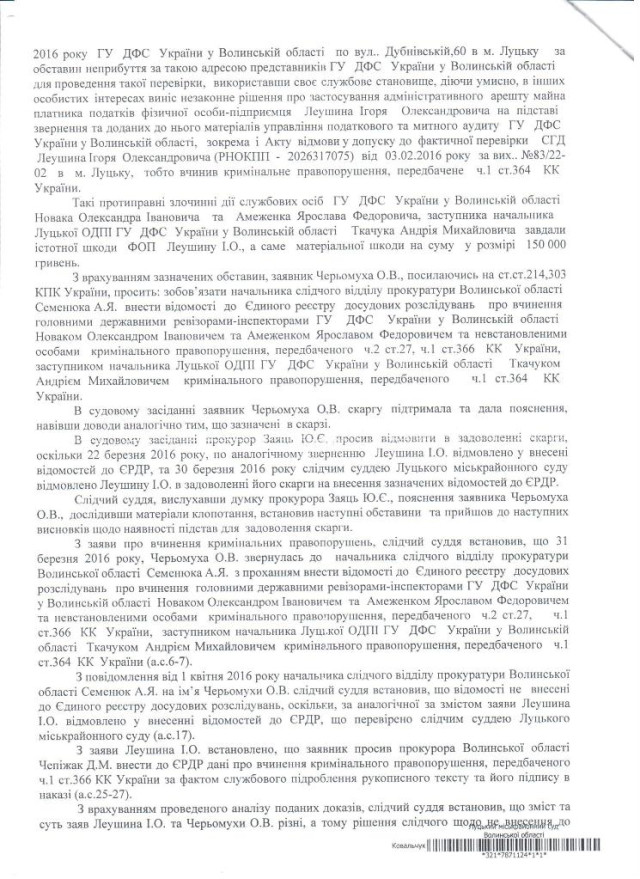 Зокрема, у тексті Скарги йдеться про те, що підприємець Леушин подав заяву до суду щодо визнання низки перевірок неправомірними, однак суд вирішив зупинити провадження.