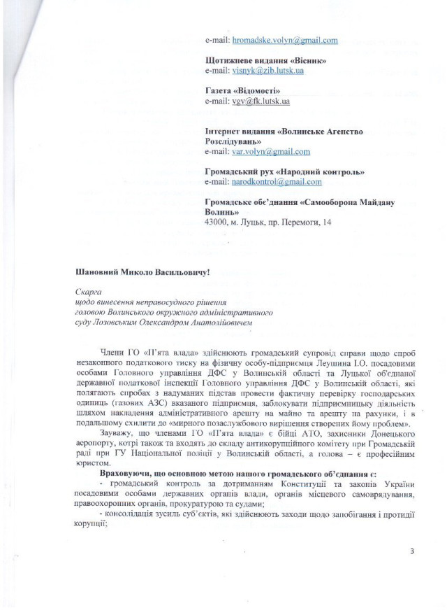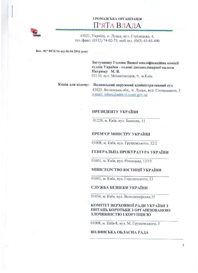 Про це йдеться у відповідній Скарзі щодо винесення неправосудного рішення головою Волинського окружного адміністративного суду (наводиться нижче).