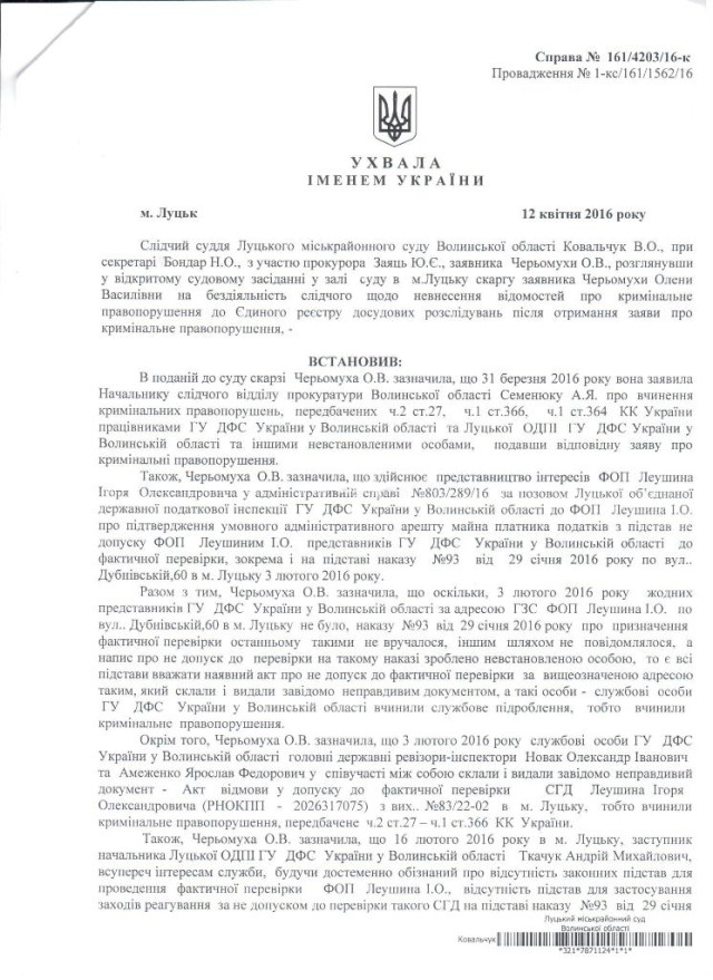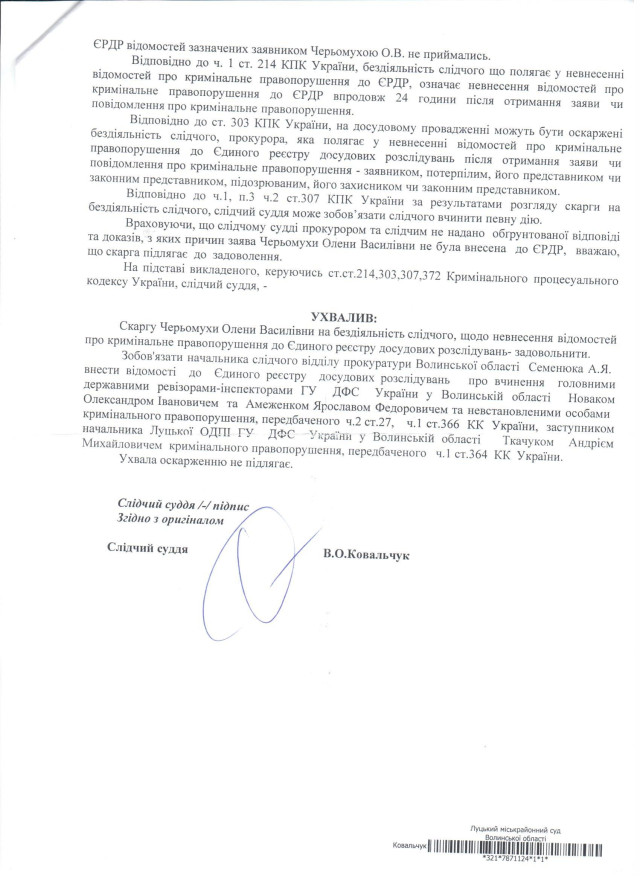 Крім того, слід зауважити, що суд зобов'язав слідчий відділ прокуратури Волинської області перевірити законність дій податківців у межах кримінального провадження.