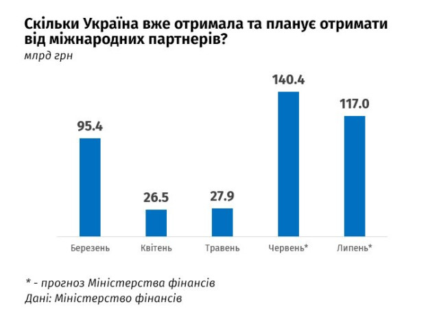 У наступні місяці Мінфін очікує отримати від партнерів більше підтримки. Зокрема, за підсумками червня одразу 4,8 млрд дол, а у липні – 4 млрд дол. Загалом до кінця року обсяг міжнародної підтримки має становити 20 млрд доларів.