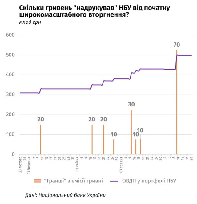 9 червня НБУ лише за один день надрукував для бюджету 70 млрд грн, а від початку широкомасштабного вторгнення регулятор перерахував Мінфіну вже 190 млрд грн.