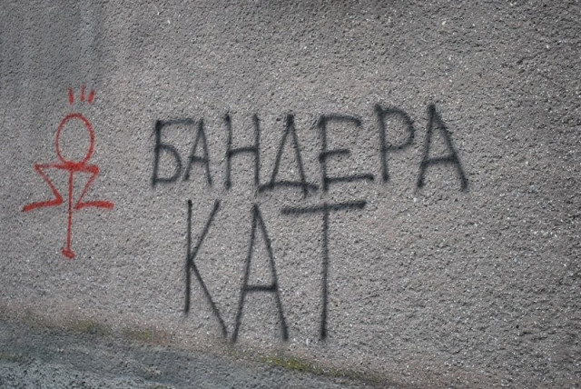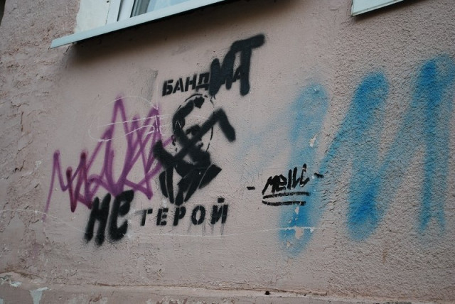«Пробандерівські» трафарети почали замальовувати. Або ж на них з’являються свастики та з’явилися і надписи аерозольною фарбою «анти бандерівського» змісту. Однак це також стирають, як, наприклад, на паркані поблизу гіпермаркету «Там-Там».