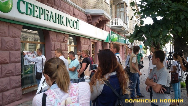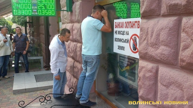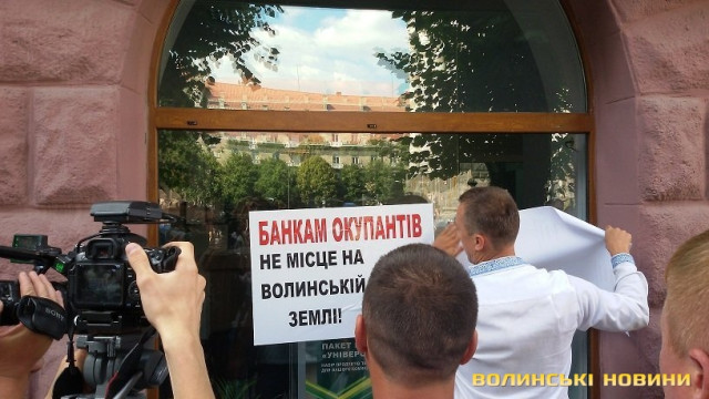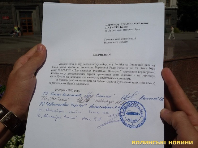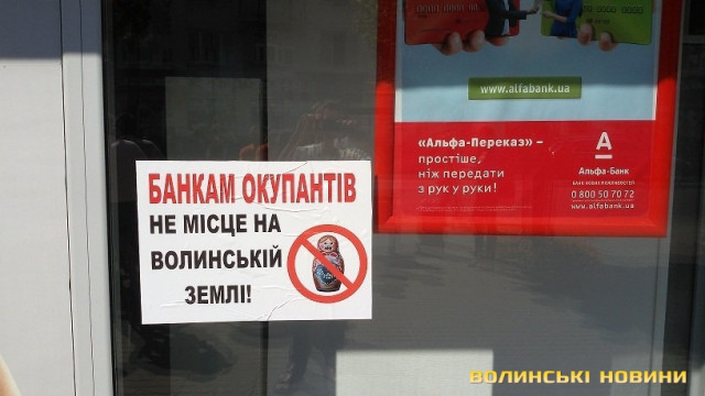 Активісти різних громадських організацій Волині, зокрема ГО «Бойкот» та ГО «Автомайдан Волині» вирішили повторити досвід своїх львівських колег та завітали до трьох найбільших російських банків у місті – «Сбербанку Росії», «Альфа-Банку» та «ВТБ». Вони передали керівникам установ звернення від імені своїх організацій з вимогою закрити власні філії. На це керівництву дали два тижні. В іншому випадку вони будуть всіма законними методами перешкоджати їхній діяльності. До слова, вчора у Львові відбулася аналогічна акція.