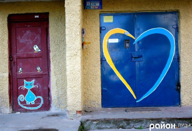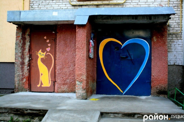 Витвори мистецтва можна побачити не лише у музеях чи в картинних галереях. Долучитися до прекрасного можна навіть тоді, коли заходиш у двері власного під’їзду. Таку можливість мають жителі вулиці Дружби народів 8, 8а, 10, 12. Тут на дверях кожного під’їзду намальоване велике серце у жовто-блакитній гамі, а збоку примостилися різнокольорові котики, - повідомляє «Район.Луцьк».