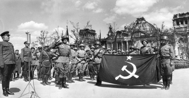 Військові радянської армії позують перед Рейхстагом, в якому 30 квітня 1945 року запеклі бої відбувалися ледь не в кожній кімнаті. Сьогодні це німецький парламент зі скляним куполом авторства Нормана Фостера, що робить Рейхстаг визначною туристичною пам’яткою.