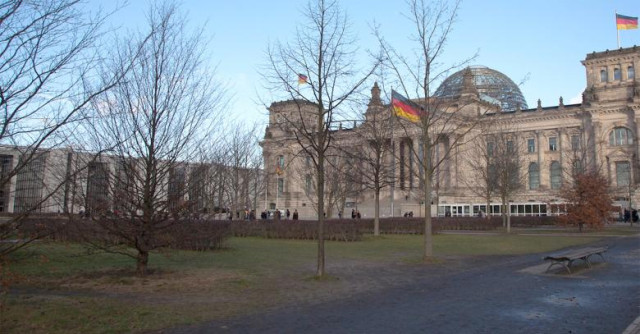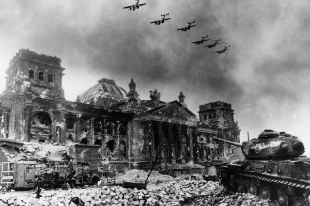 Обстріляний та понівечений Рейхстаг у районі Берлін-Тіргартен під час останніх бойових дій впродовж битви за Берлін. Цікаво, що літаки у небі над Рейхстагом – фотомонтаж для публікації у газеті «Правда».