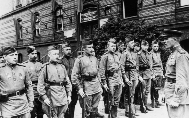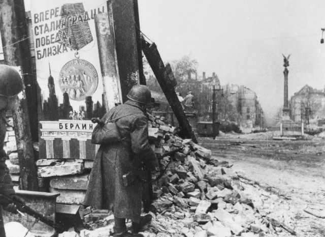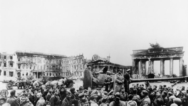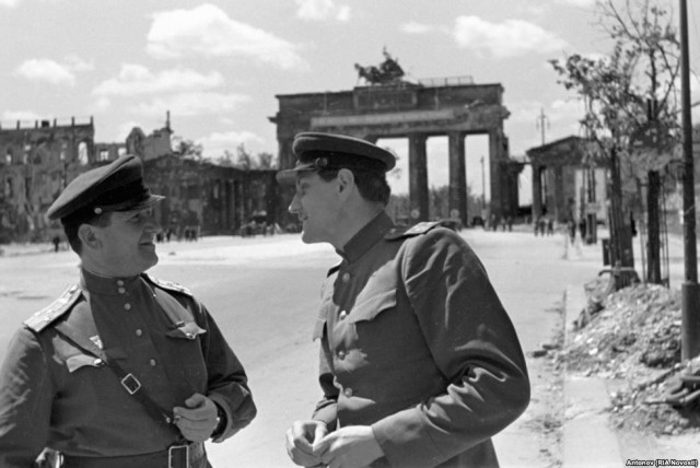 На фото буремних часів закінчення Другої світової війни у Європі та капітуляції гарнізону Берліну можна зауважити катастрофічні спустошення столиці держави-агресора та радянських вояків, які фотографуються на фоні здобутого міста.