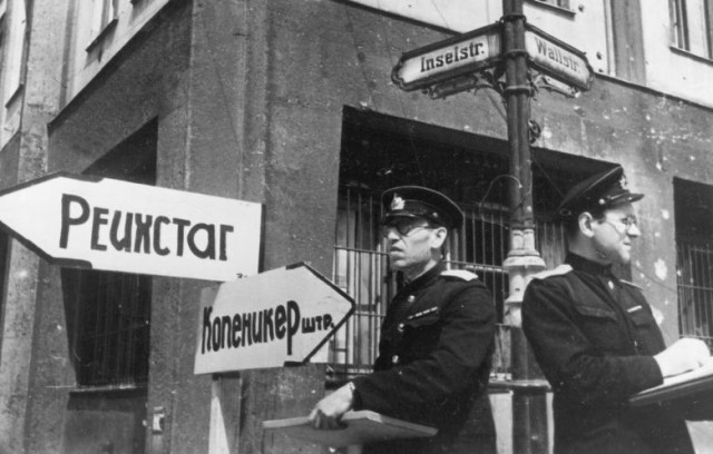 На розі вулиць Інзельштрасе та Вальштрасе у районі Берлін-Мітте у 1945 році на вказівнику – записані кирилицею керунки на Рейхстаг та Копенікерштрасе.