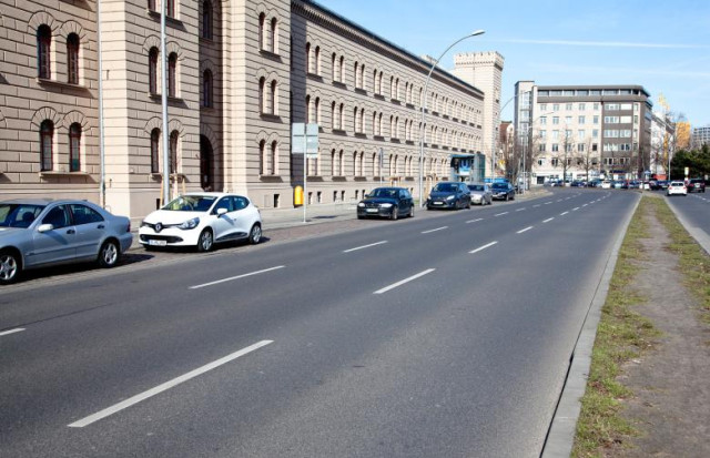 Вулиця Мерінгдамм у 1945 році, район Берлін-Кройцберг: радянські солдати на марші повз управління фінансів Кройцбергу. Хоча вигляд вулиці нині змінився і окремі будівлі зникли, споруда управління фінансів відновлена.