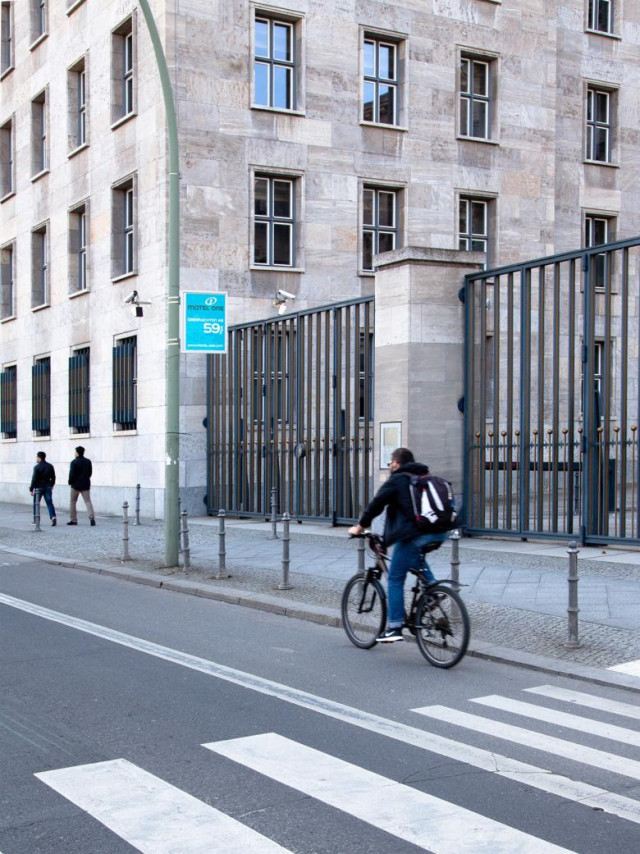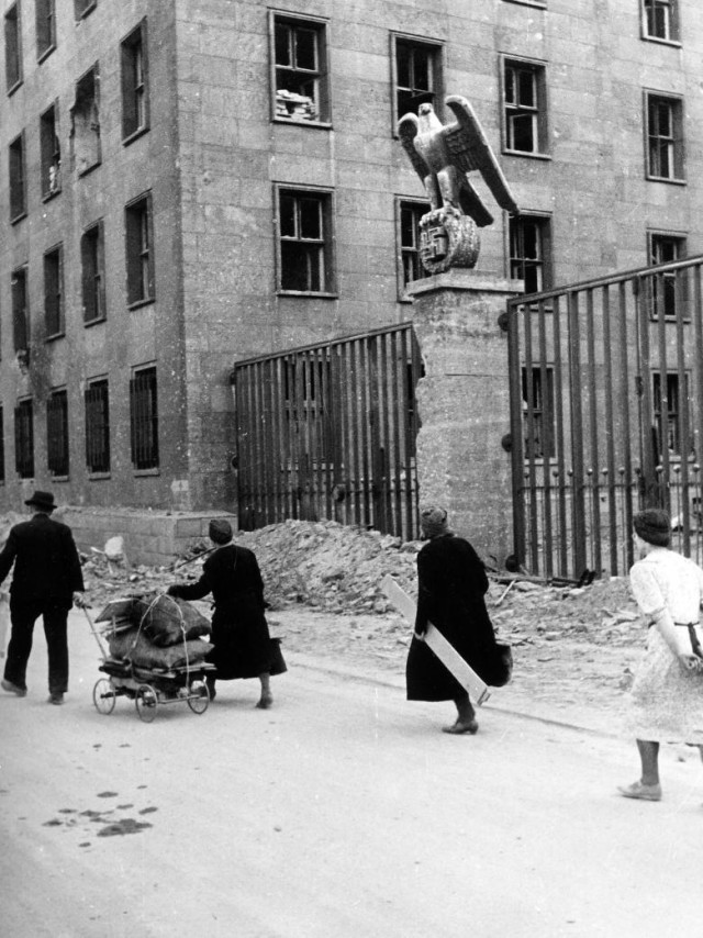 Вулицею Вільгельмштрасе у районі Берлін-Мітте біженці проходять повз Імперське міністерство авіації (нині – Міністерство фінансів). Масивна будівля збереглася майже у первозданному вигляді, бракує лише імперського орла, що тримав у лапах свастику.