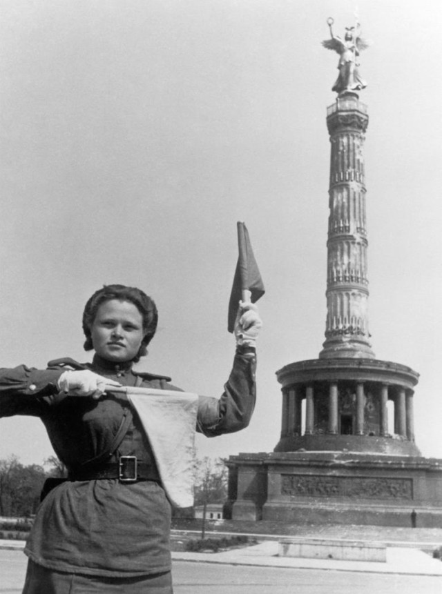 Майдан Гросер-Штерн в районі Берлін-Тіргартен – дорожній рух поблизу постраждалої від обстрілу колони Зігесзойле регулює дівчина-червоноармієць. Сьогодні біля підніжжя колони відпочивають берлінці та гості міста.