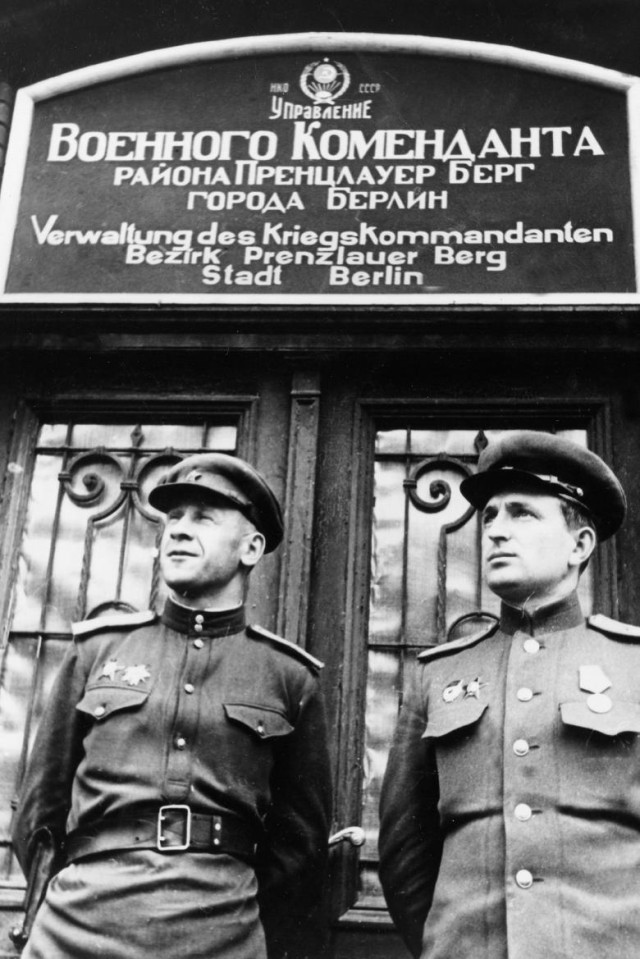 На двох наступних фото на майдані Парізер-плац (Паризька площа) поет Євгеній Долматовський та бійці червоної армії святкують перемогу. Сьогодні ж тут фотографуються гості міста, туристам пропонують покататися кінним екіпажем і нічого не нагадує про роки, коли майданом пересувалися радянські танки.
