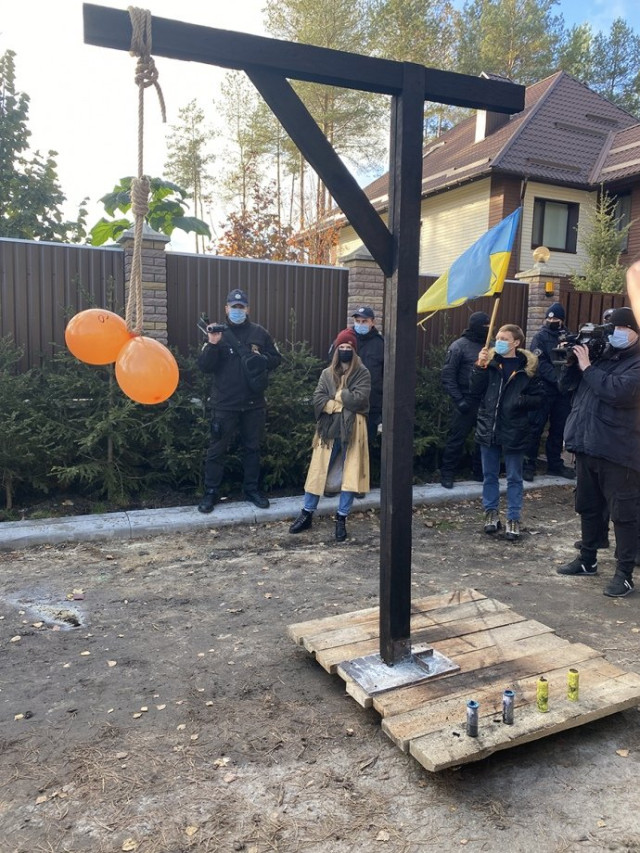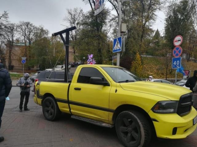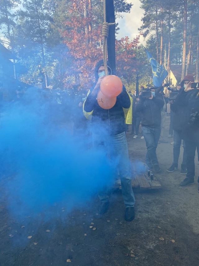 Поліція заблокувала рух учасників автопробігу. Учасники говорили, що не пропускати їх незаконно.Поліція у гучномовець закликала дотримуватися порядку. Між учасниками автопробігу та правоохоронцями сталися поодинокі сутички.Пізніше було досягнуто домовленості, що дві автівки проїдуть на 5 метрів, а люди розтягнуться вздовж паркану на відстані витягнутої руки. Поліція відійшла на 5 метрів і зупинилася.Зрештою учасникам вдалося встановити шибеницю біля паркану.Як видно з опублікованих ЦПК фото, активісти також запалили димові шашки.
