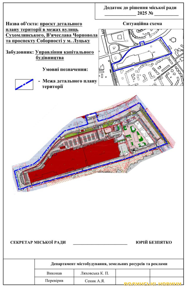 Про це йшлося 26 листопада на сесії міськради. Депутати розглянули проєкт рішення про погодження проєкту детального плану території в межах вулиць Сухомлинського, В’ячеслава Чорновола та проспекту Соборності в Луцьку.
