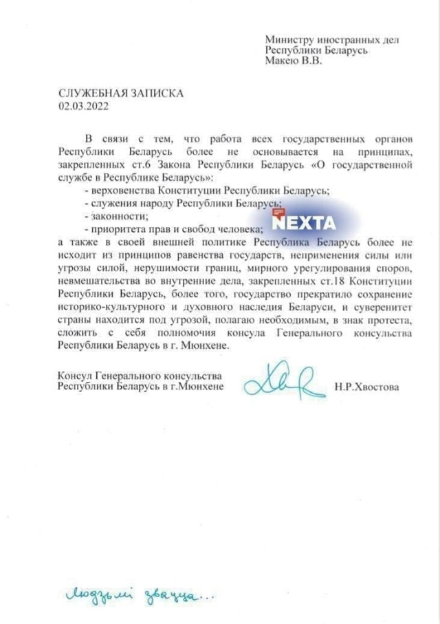 Зокрема заяву на звільнення написала консул Генконсульства Республіки Білорусь в Мюнхені Наталія Хвостова.