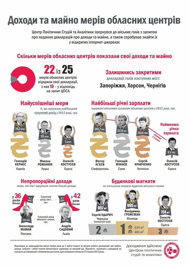 22 із 25 мерів обласних центрів відкрили свої декларації, з них 13 - у відповідь на запит ЦПСА. Закритими залишилися декларації про майно і доходи мерів Запоріжжя, Херсону, Чернігова.
