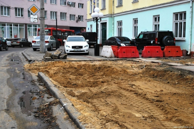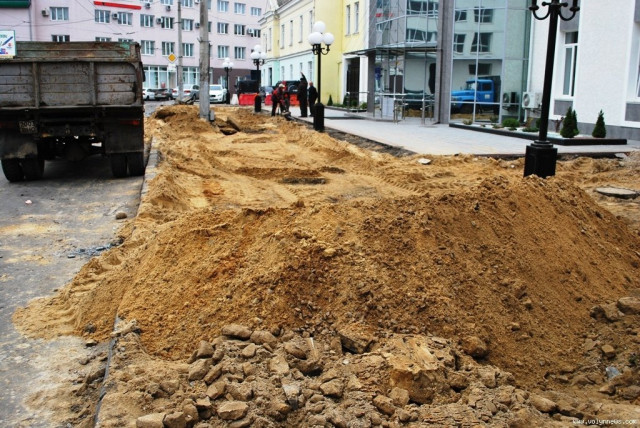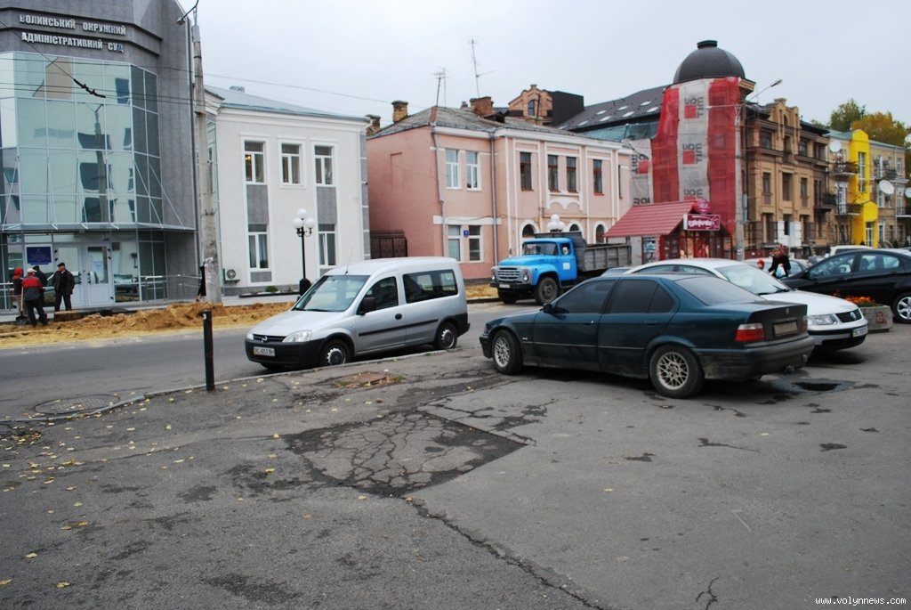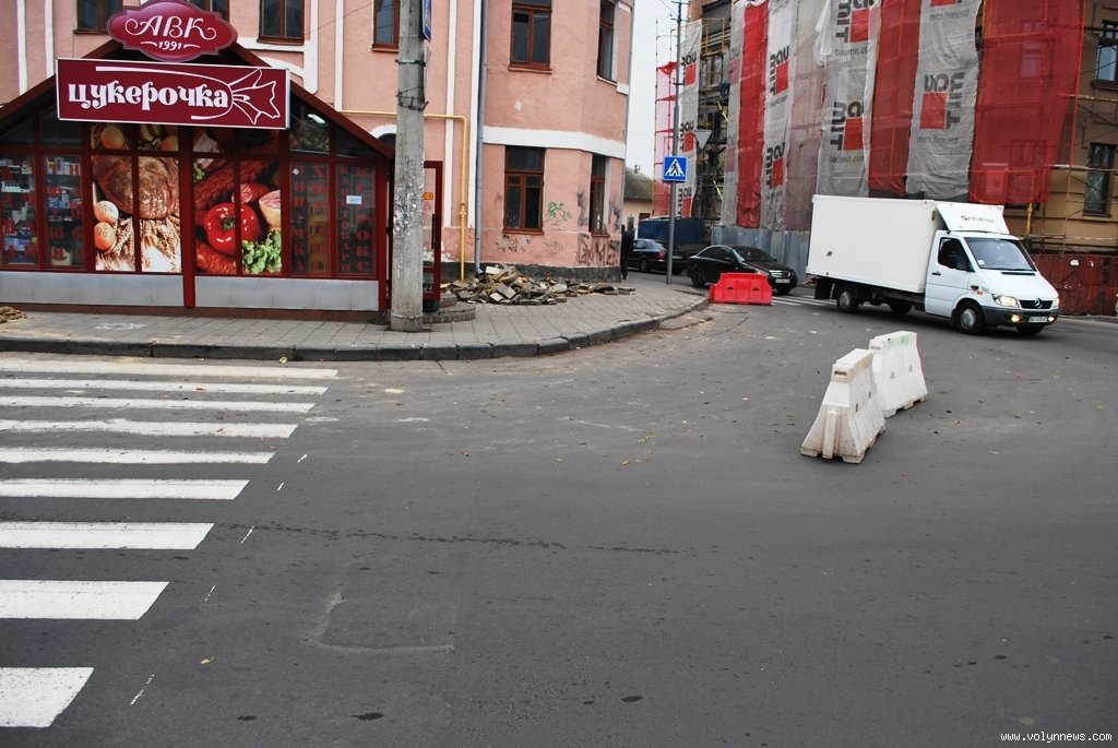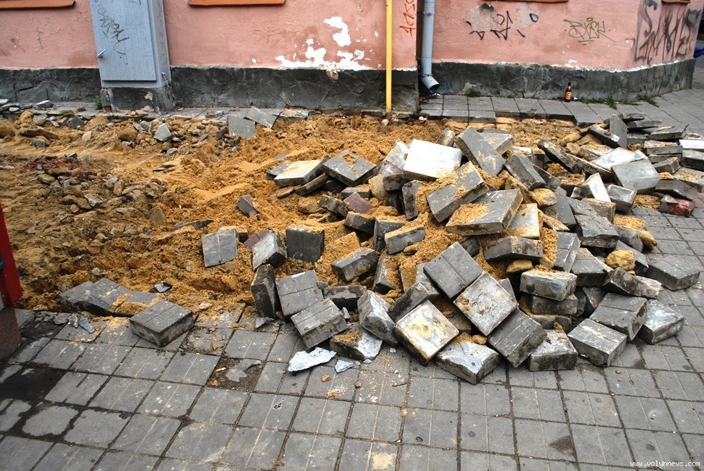 Гори піску, частина якого вже на проїжджій частині, складена поодаль бруківка, нові ліхтарі та одинокий кіоск – все, що лишилося від однієї з найстаріших зупинок громадського транспорту в Луцьку «Драмтеатр».