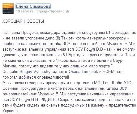 Прокурори дали спокій командиру спецгрупи 51 бригади Павлові Процюку. Його «тягали» на допити, але крімінальне провадження щодо нього так і не відкрили, - написала у Фейсбуці тележурналіст Олена Симашова.