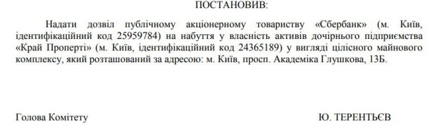 20.02.2018 АМКУ схвалив придбання українською «дочкою» «Сбербанку» двох готелів в Одесі у ВАТ «Туристично-виробнича фірма «Чорне море» Леоніда Клімова.30.11.2017 АМКУ надав дозвіл ПАТ «Сбербанк» (м. Київ) на одержання в управління активів у вигляді цілісного майнового комплексу ТОВ «Маріупольський Млинкомбінат» (Донецька область).