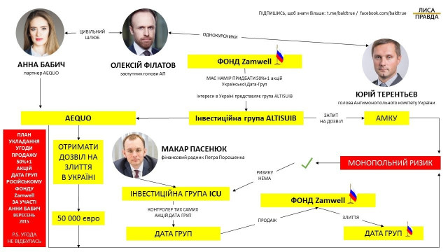 В цілому: фонд Zamwel через посередника в Україні ALTIUSIB, звертається до компанії Анни Бабич з проханням вирішити всі юридичні питання продажу української «Датагруп» з рук ICU (де голова Макар Пасенюк) до самого фонду Zamwel. Так як йдеться про 50%+1 акцій, то без участі Антимонопольного комітету не обійдеться. Як ніяк 2015 надворі. Другий рік війни. І буде чимало запитань, чому росіяни конкретно вохрять на український телекомунікаційний ринок.
