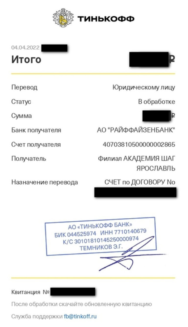 3. Про те, що компанія «ШАГ» продовжує вести бізнес в РФ, також свідчать квитанції, які клієнти отримують після оплати курсу в «TOP Комп’ютерній Академії». Отримувачем коштів є «Академія ШАГ».Корчевський пояснив, що після закриття бізнесу в РФ його російські партнери, апелюючи до порушення умов договору з «ШАГ», просто скопіювали його старий сайт і продовжили роботу під брендом «TOP Комп’ютерної Академії». «Ніякого відношення до ШАГ ні бренд, ні нова компанія не мають», – запевнив він.