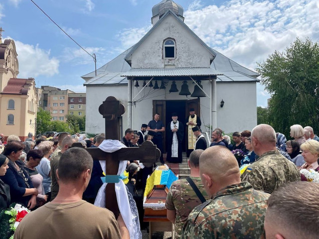 «Місто знову у жалобі. Сьогодні в останню путь провели Захисника Вадима Семенюка. Прощання із загиблим військовим відбулося у Свято-Михайлівському храмі.