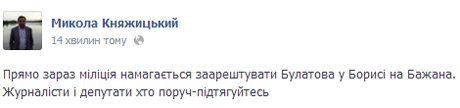 «Прямо зараз міліція намагається заарештувати Булатова у Борисі на Бажана. Журналісти і депутати хто поруч – підтягуйтесь», - зазначив він.