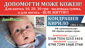 Для лікування дитини потрібно 2 325 000 доларів. Сім'я Руслана і Дар’ї Кондрашевих не має таких грошей. На даний час зібрано 20% від необхідної суми. У Донецькій області охочих допомогти маленькому хлопчику майже нема.