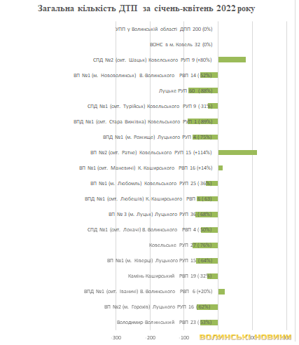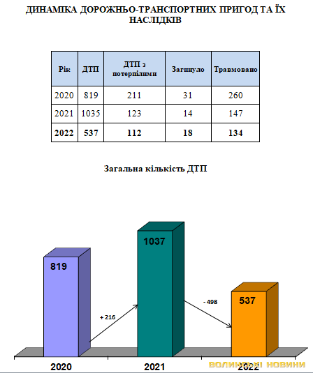 За січень-квітень 2022 року на вулично-дорожній мережі Волинської області зареєстровано 537 дорожньо-транспортних пригод, що на 48% менше аналогічного періоду минулого року. У 2020 році за цей період трапилося 819 ДТП, у 2021 – 1035, а за аналогічний період цього року кількість ДТП зменшилася майже на половину – 537. У порівнянні з попередніми роками зменшилася і кількість травмованих: у цьому році – 134, у минулому – 147, в 2020 році – 260. Однак кількість загиблих у порівнянні з минулим роком зросла: цьогоріч у ДТП загинуло 18 людей, у минулому році ця цифра була меншою – 14, в 2020 за перших чотири місяці року загинула 31 особа.У патрульній поліції Волині таку статистику напряму пов’язують з війною. Речниця волинських патрульних Валентина Мельник відзначила, що зменшення кількості ДТП майже вдвічі у порівнянні з аналогічним періодом минулого року залежить від повномасштабного вторгнення росії в Україну.