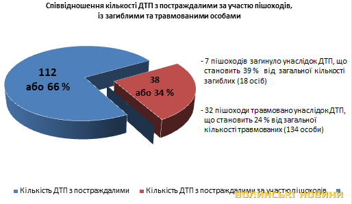 Також спостерігається зменшення кількості загиблих дітей у порівнянні з минулим роком на 100% (з 4 до 0), своєю чергою, кількість травмованих дітей зменшилась на 29% (з 17 до 12).Щодо ДТП за участю пішоходів, то за вказаний період зареєстровано 38 ДТП з постраждалими, що становить 34% від загальної кількості ДТП з постраждалими (загальна кількість ДТП з постраждалими – 112), в яких загинуло 7 осіб та 32 особи травмовано.