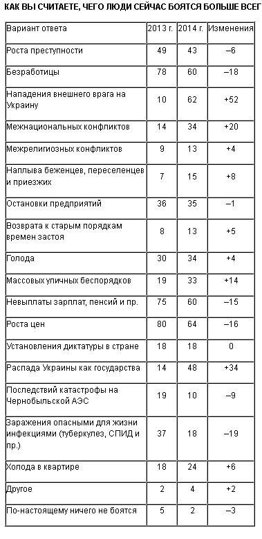 На першому місці серед найбільш актуальних для українців страхів - страх нападу на країну зовнішнього ворога. Згідно з інформацією соціологів, торік страх зовнішнього вторгнення випробовували 10% опитаних, а цьогоріч - вже 62%. На другому місці - розпад України як держави (14 і 48% відповідно). На третьому - страх виникнення міжнаціональних конфліктів. В 2013-му за нього висловилися 14%, в 2014-му - 34%.