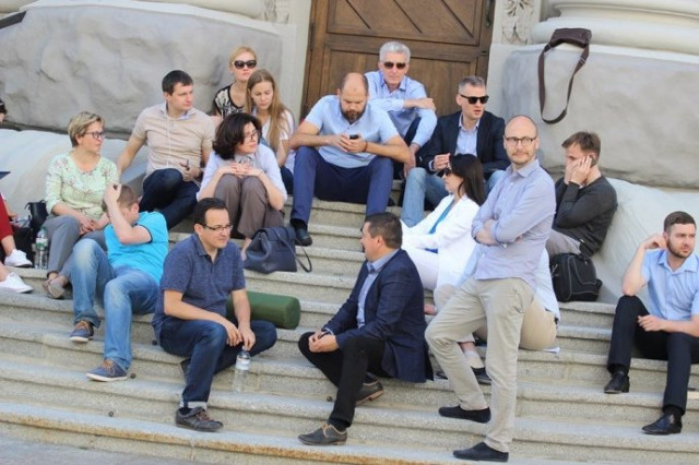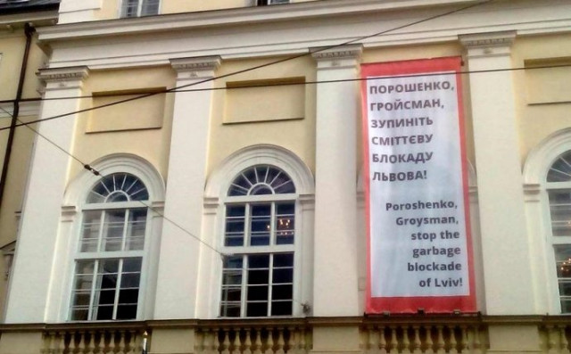 Пізно увечері 13-го червня на Ратуші з'явився величезний банер із закликом "Порошенко, Гройсман, зупиніть сміттєву блокаду Львова". Щоб напис могли прочитати усі іноземні туристи, його переклали англійською.