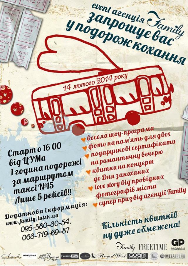 • Тролейбус кохання | 14.02, п'ятниця«Тролейбус Кохання» — це справжня казка для закоханих і для тих, хто шукає свою другу половинку. Святкові декорації, оригінальні валентинки, веселий ведучий, романтична музика, цікаві конкурси, цінні подарунки а також фото на пам'ять для двох та ще багато цікавого.