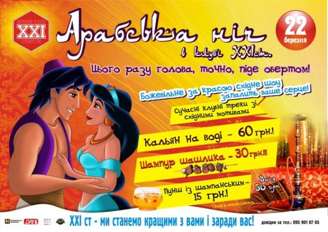 22 березня в клубі ХХІ століття «Арабська ніч». Звучатимуть сучасні треки зі східними мотивами.