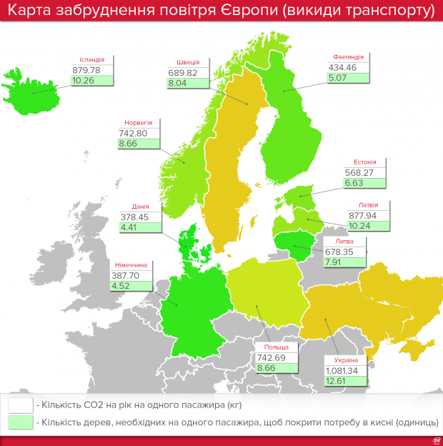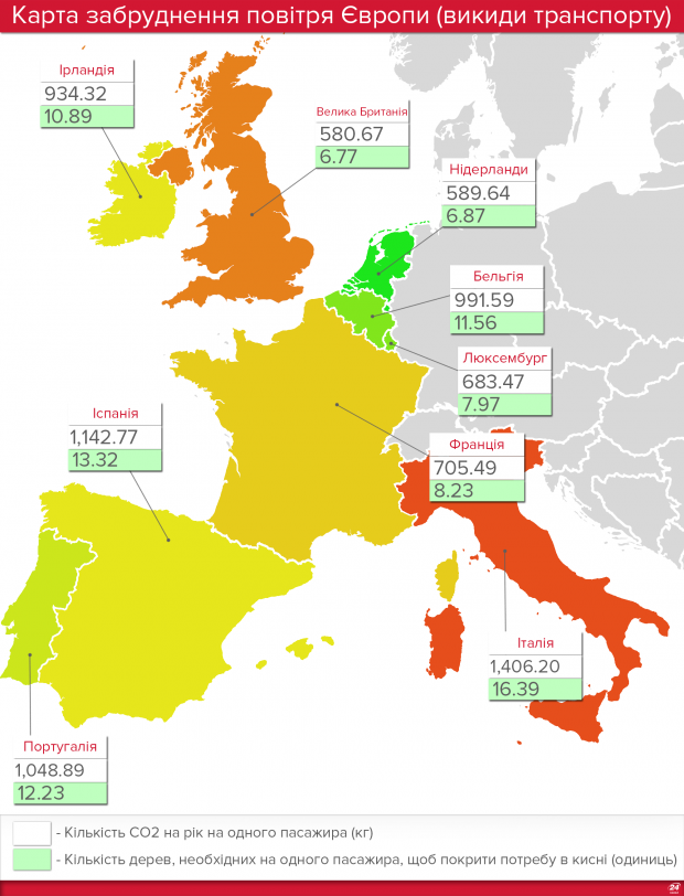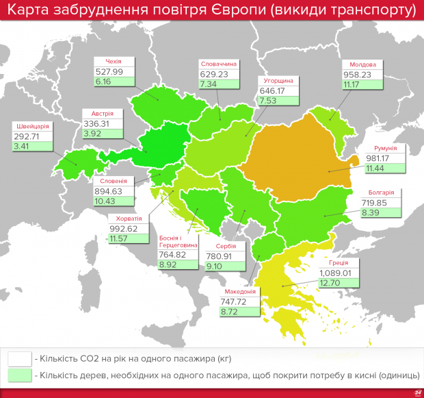 Серед європейських столиць найзагазованішими є також Лондон, Париж, Мадрид, Бухарест, Стокгольм, Афіни й Київ. Кількість СО2 на одного пасажира в рік в українській столиці становить 1084 кг. Щоб компенсувати потребу у кисні, для кожного пасажира треба посадити 13 дерев.