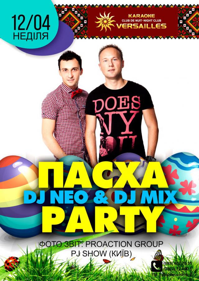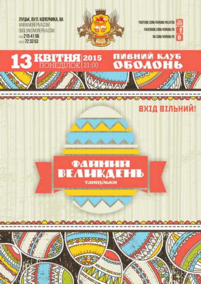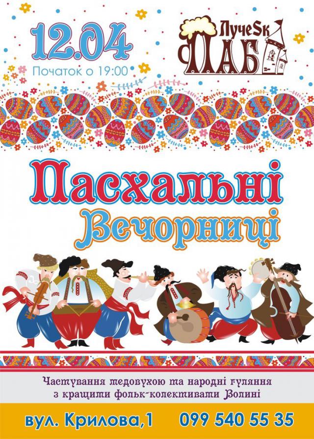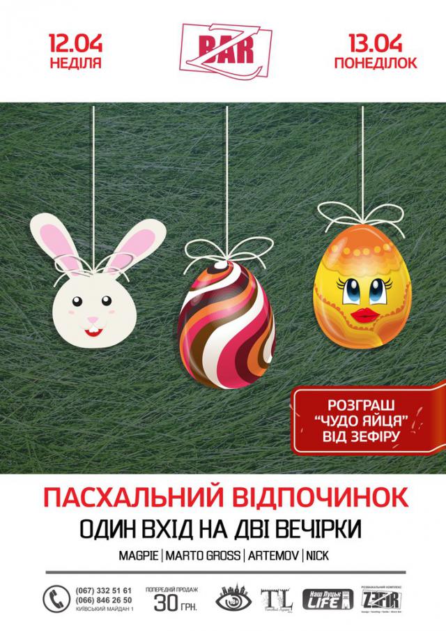 «Зі святом Великодня Вас вітаємо та даруємо неймовірні гуляння під ритми кращих діджеїв міста!», - пишуть організатори дійства. Для вас гратимуть DJ Magpie, Dj Marto Gross, Dj Nick, Dj Artemov.• «Пасхальні вечорниці» в пабі «Лучеськ» | 12.04, неділя• Великдень у «RingDj-Cafe» | 12.04, неділя – 13.04, понеділок• Пасха з Dj Neo та Dj Mix у «Версалі» | 12.04, неділя• Святкові Великодні танцульки в «Оболоні» | 13.04, понеділок