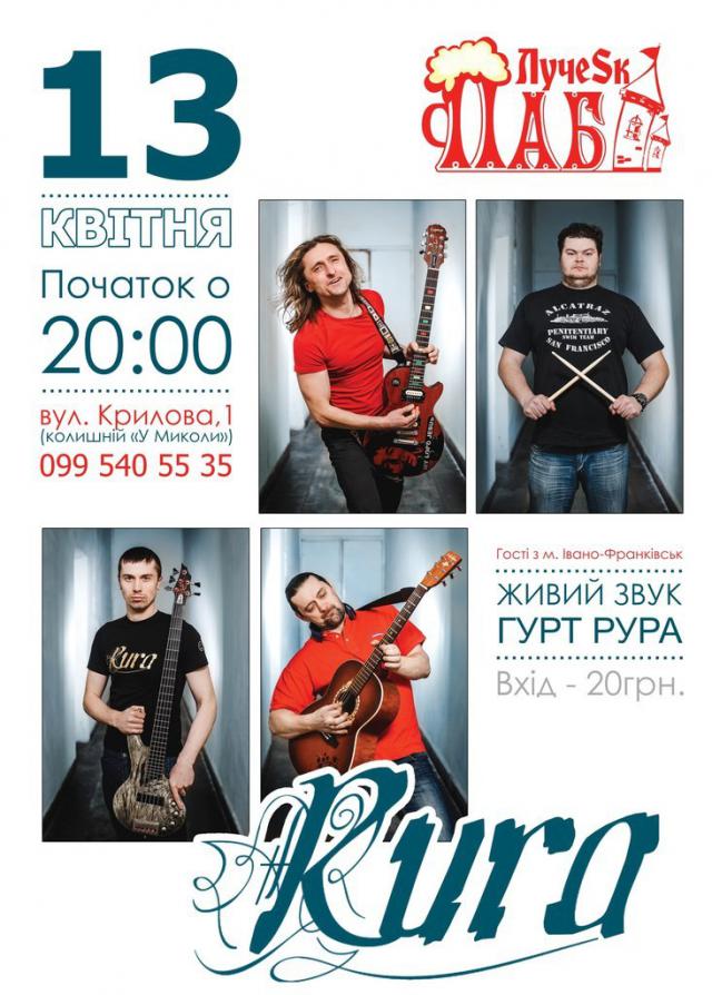 13 квітня о 19.00 у кінотеатрі «Premier City» відбудеться урочистий допрем’єрний показ повнометражного українського фільму «Смертельно живий». Презентувати фільм до Луцька приїде особисто головний герой фільму, актор Олександр Герелес.• Виступ гурту «Рура» | 13.04, понеділокВолинський обласний музично-драматичний театр імені Тараса Шевченка: