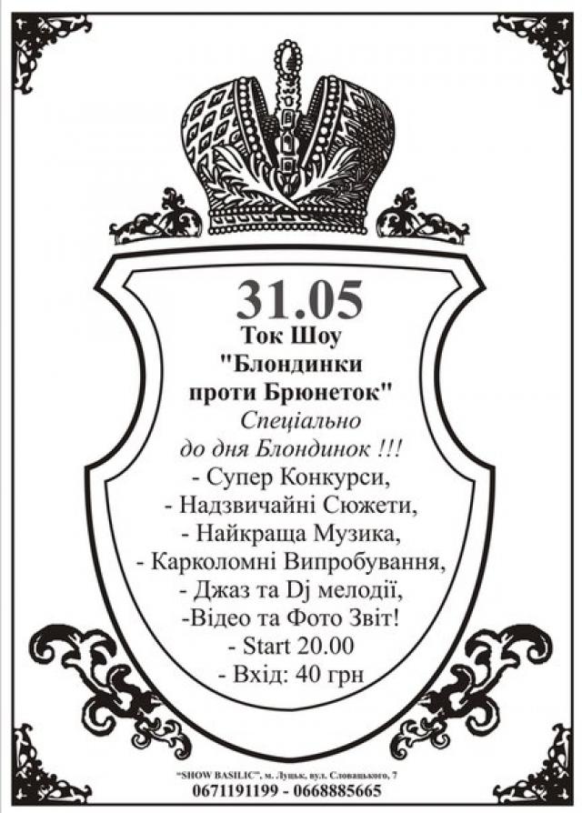 31 травня в «Шоу Базилік» ток шоу «Блондинки проти брюнеток» спеціально до дня блондинок. На гостей чекають конкурси, надзвичайні сюжети, джаз та Dj мелодії. Початок о 20:00. Вхід 40 грн.
