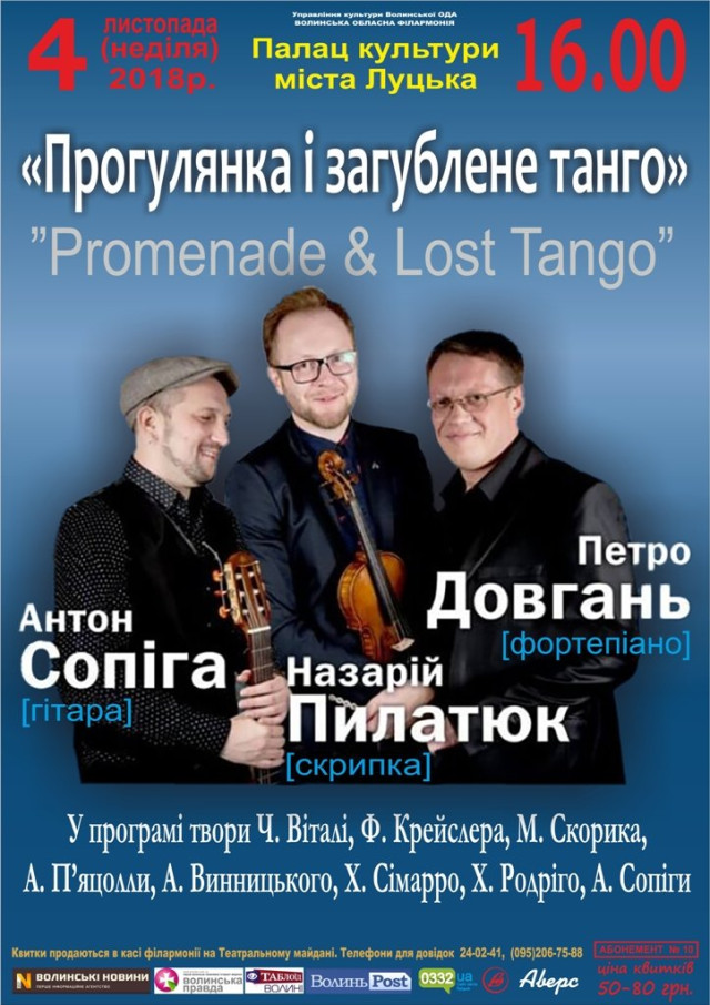 Всеукраїнський фестиваль співаної поезії та авторської пісні «Оберіг» у Палаці культури міста Луцька| 1–3 листопадаМегафінал ІХ Національного конкурсу краси «Міс принцеса України» у Волинському обласному академічному музично-драматичному театрі імені Тараса Шевченка | 2 листопадаТільки Хіти. Танці в пивному клубі «Оболонь» | 2 листопадаВиставка робіт Сірого Сержа «В горах» у РЦ «Промінь» | 2 листопада – 18 грудняКонцерт Pianoбоя у РЦ «Промінь» | 3 листопадаТренінг «Teambuilding: як працювати разом та не вмерти по дорозі» в Молодіжному центрі Волині | 3 листопадаМузично-розважальна забава «Меломан» у пивному клубі «Оболонь» | 3 листопадаЛіхтар: поезія та музика в пивному клубі «Оболонь» | 4 листопадаКонцерт «Прогулянка і загублене танго» в Палаці культури міста Луцька | 4 листопада«VIP Тернопіль Comedy Шоу» у Волинському обласному академічному музично-драматичному театрі імені Тараса Шевченка | 5 листопадаЧитання поезії Віктора Лазарука у Волинській обласній бібліотеці для юнацтва | 6 листопадаКонцерт Арсена Мірзояна у РЦ «Промінь» | 7 листопадаПрезентація збірки Ігоря Астапенка «Шампанське–пиво–шампанське» у книгарні «Є» | 7 листопадаКонцерт Волинського державного академічного українського народного хору «40 років на сцені» у Волинському обласному академічному музично-драматичному театрі імені Тараса Шевченка | 7–8 листопадаПідпільний стендап у РЦ «Промінь» | 8 листопада
